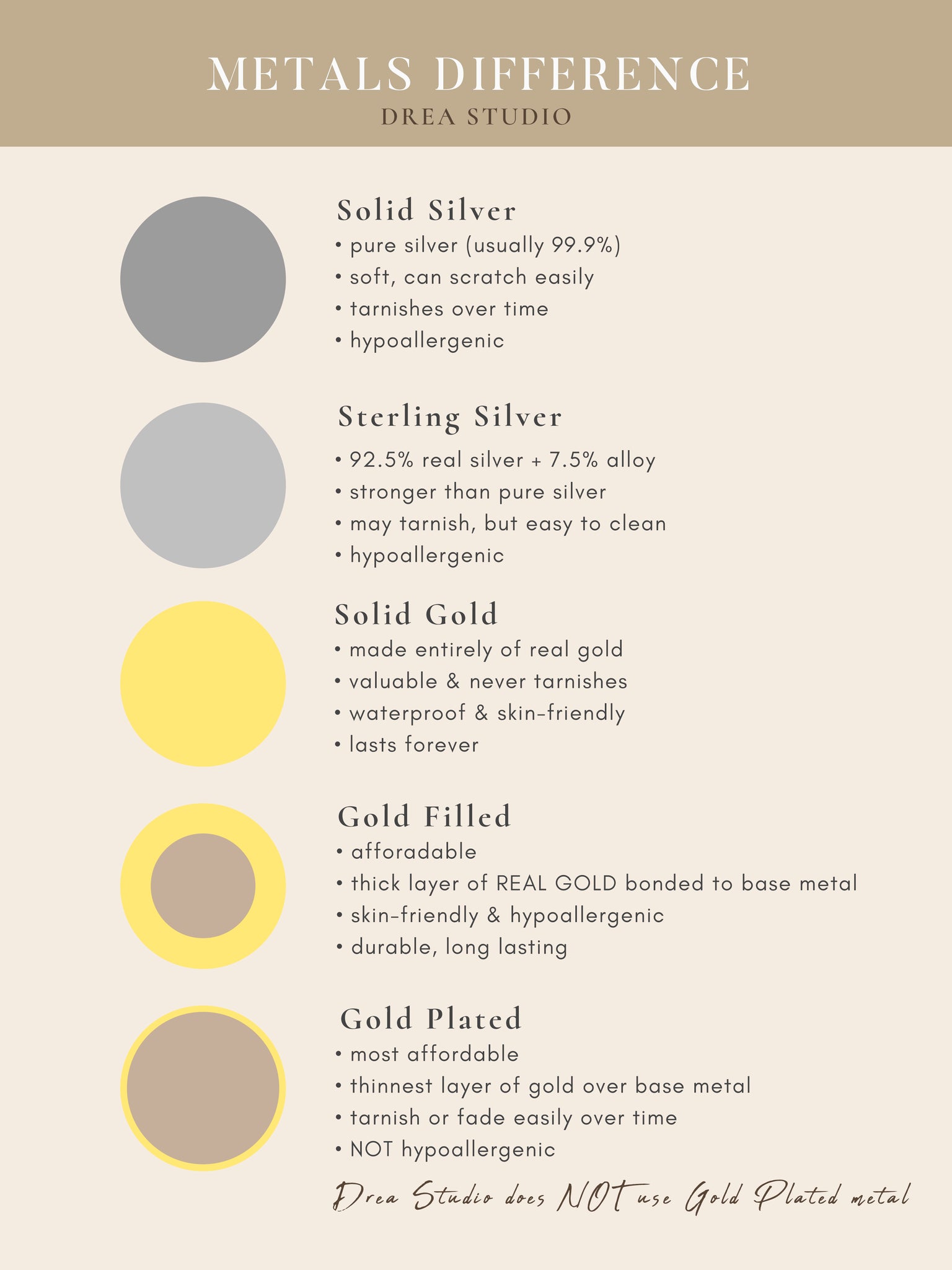 Most of our findings and wires are made with 14k gold filled. “Gold-filled” is a USA industry standard that legally requires 5% pure gold by weight. It is a solid layer of gold bonded to another metal through heat and pressure. It does not wear off or turn colors over time, and if taken care of properly it can last a lifetime. Gold-filled jewelry is a cheaper, yet the best alternative to solid gold. It’s hypoallergenic and water-safe.